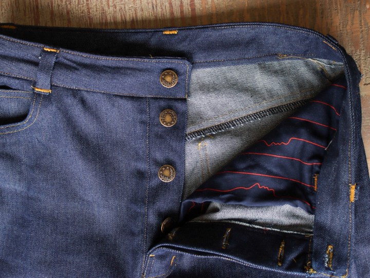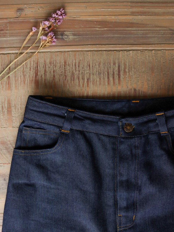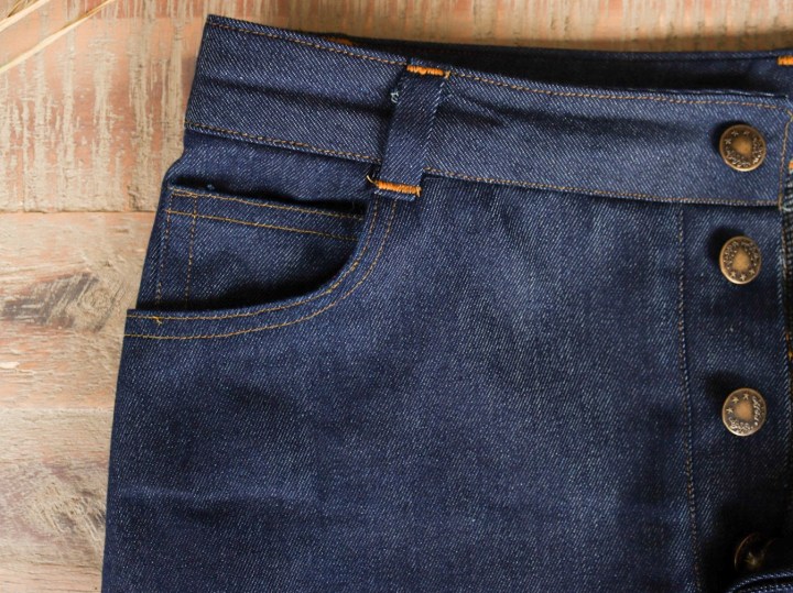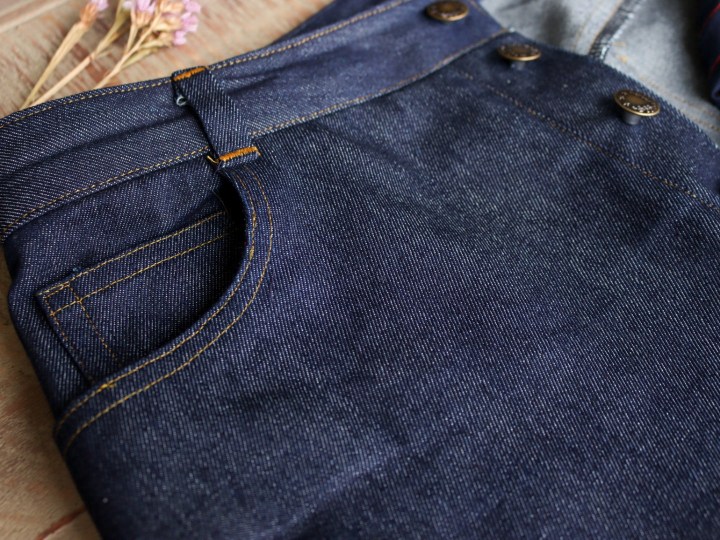 The pattern offers the classic vintage button fly closure or a zip closure. If your machine struggles sewing buttonholes, and you’re using heavier material, I would opt for the zipper, as this is a little easier to construct. Because I had a lighter-weight denim I chose the button front.