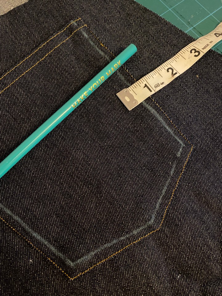 When it came to topstitching, this was the first time I had used a contrasting topstitch thread on jeans so I marked a stitching line on the material before I went to the machine. This is also worth doing when the needle plate is not visible as you sew so mark the seam allowance on your fabric before you stitch pieces together.