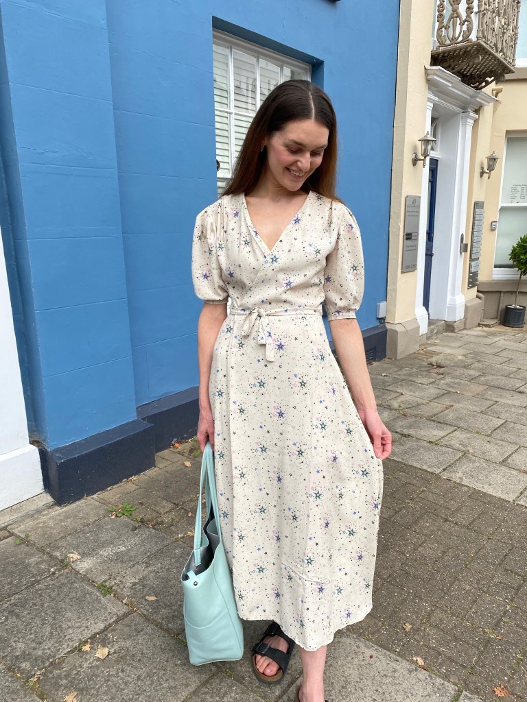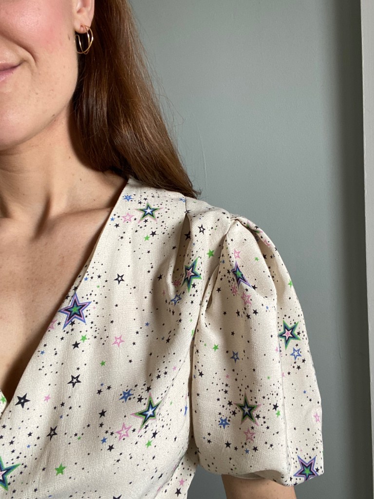The fabric itself was sent as part of the Fabric Godmother Dream Wardrobe subscription – I honestly believe this subscription has saved me from many a stressful evening deciding between different fabrics and patterns (I am a Libra and very indecisive!). This viscose crepe by Fabric Godmother features a scattering of pretty star motifs on a pale background and feels lovely and soft against the skin; a really nice fabric for the warmer months.