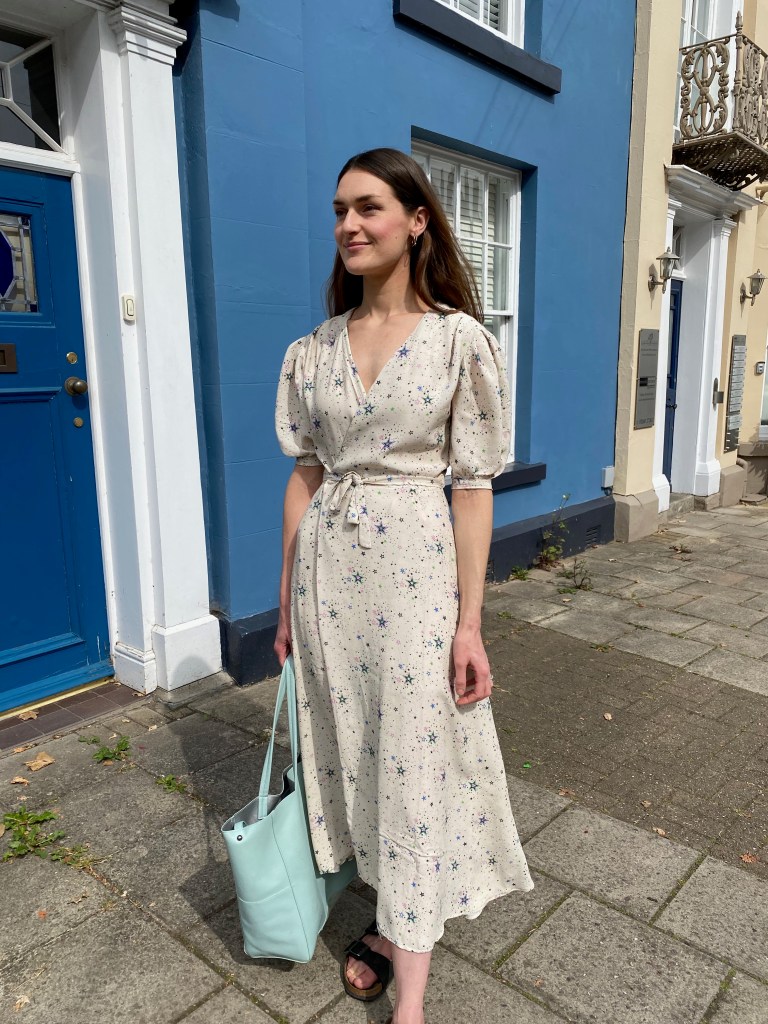 There is something so satisfying about tweaking a pattern you already own to realise the garment you have in mind. Thinking of a suitable pattern for this fabric wasn’t quite a light bulb moment, however. I had mulled over possible patterns that would show off this starry print for a while before revisiting my stash for some inspiration. I remember really liking the easy-to-wear wrap style of the McCall’s 8036 and thought it would be simple enough to extend the skirt to make a midi dress version.