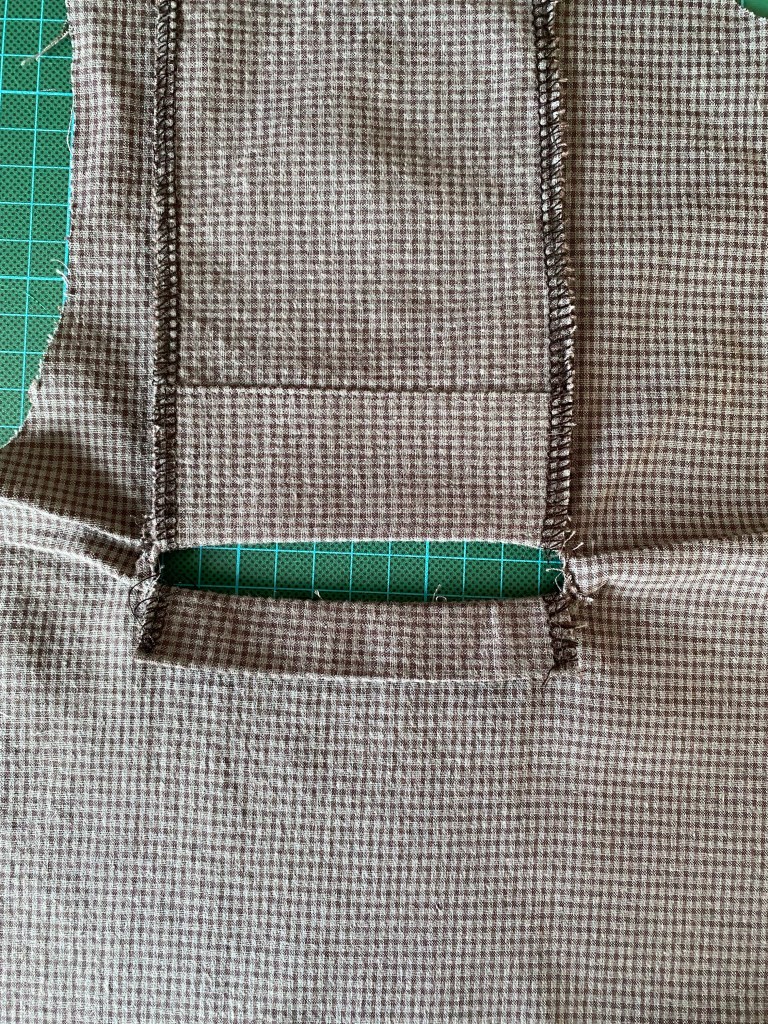 I found step 19 concerning the welt pocket a little confusing. The instructions ask you to post the welt and pocket bag through the hole on the bodice to the back of the fabric, but the space didn’t seem wide enough, and all the fabric looked pulled on the right side. I tried to widen the gap to push the welt and pocket bag through, but it made a bit of a mess. I ended up hand-stitching around the welt. It looks okay, but it is no longer a pocket!