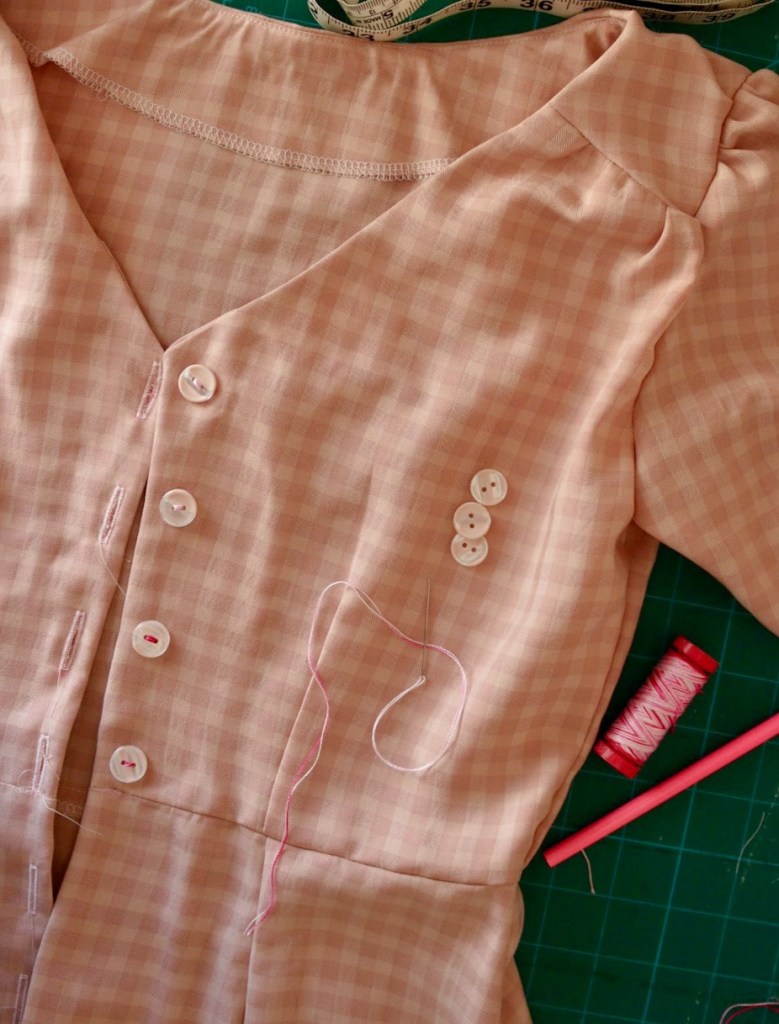 The pattern requires you to sew a lot of buttons, so take your time with this step and use the button markings on the pattern sheet to mark the button placements before sewing.